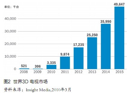 Insight Media市場研究公司3月發(fā)表的最新報(bào)告更加樂觀,預(yù)測世界3D電視市場將從今年的340萬臺(tái)飚升到2015年的4965萬臺(tái),增長10倍還多(圖2),屆時(shí)占有率將超過20%。其對(duì)手公司iSupp1i公司尤其樂觀,認(rèn)為同期世界3D電視市場將從420萬臺(tái)竄升到7800萬臺(tái),占有率達(dá)40%,銷售額644億美元。