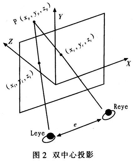 由以上研究可知,立體圖像對的產(chǎn)生是由于左、右眼觀察到的物體透視結果不同。因此在立體顯示的視景仿真中設置兩只虛擬的眼睛,一個獲取左眼的圖像,另一個獲取右眼的圖像,分別將左右眼的圖像傳送給相應的眼睛。因此。在立體顯示中,需要采用包含兩個視點的透視投影方法一雙中心投影算法。圖2為雙中心投影。