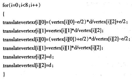 按上述投影算法計算出立體圖像對后,應用OpenGL繪制立體圖像對,分別用紅、綠兩種顏色繪制右眼和左眼的圖像。以一個變長為10cm,中心點在原點的正方體為例,設兩視點間距離e為5cm,投影面距高觀察者d為40cm,考察正方體的一個頂點(5,5,5),由上述投影算法可得:xr=32cm,xl=48cm,yl=yr=4040cm,zr=zl=d=40cm對8個頂點分別計算后,連接相應的立體透視投影點,即可得該立方體的立體圖像對。用數(shù)組vertex[8][3]存儲頂點,數(shù)組translatevertexr[8][3]存儲右眼投影計算后坐標,數(shù)組translatevertexl[8][3]存儲左眼投影計算后的坐標,對相應的點進行投影計算: