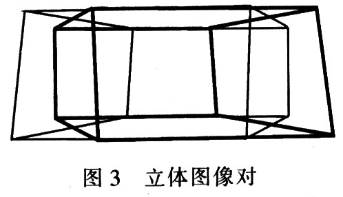 使用簡單的濾光鏡就可觀察有立體感的圖像。其原理是:由于濾光片(實驗中使用紅、綠濾光片)吸收其他光線,只讓相同顏色的光線通過,因此左、右眼各透過不同顏色的光。當使用濾光鏡觀察計算機屏幕上的立體圖像對時,就會看到具有深度感受的圖像。在實驗中發(fā)現(xiàn),刷新頻率對圖像立體效果的形成具有重要作用。刷新頻率過低,由于人眼所維持的圖像已消失,不能得到三維立體感受;刷新頻率過高就會出現(xiàn)一只眼睛可看到兩幅圖像的現(xiàn)象。將顯示的刷新頻率設置合適,在程序中設置圖像刷新頻率設置為50Hz,利用紅綠濾光鏡觀察模型的立體成像,得到較明顯的立體視覺效果。