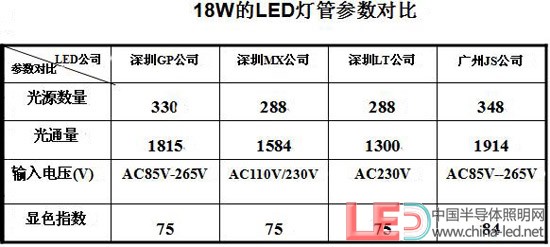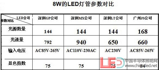 通過上面的表格可以看出,以上我們?nèi)我膺x擇的四家公司的LED燈管的相關(guān)結(jié)果數(shù)據(jù)有的參數(shù)會(huì)有會(huì)有一定的差別,選用LED光源的數(shù)量從144-168顆,光通量也從650-940LM,相差的范圍有290LM之多,輸入的電壓有寬電壓,也有窄電壓。顯色指數(shù)基本在Ra=75左右,國家LED燈具標(biāo)準(zhǔn)出臺(tái)后會(huì)有一個(gè)標(biāo)準(zhǔn)和規(guī)范。以上為各廠家自行測試結(jié)果(如上圖所示)