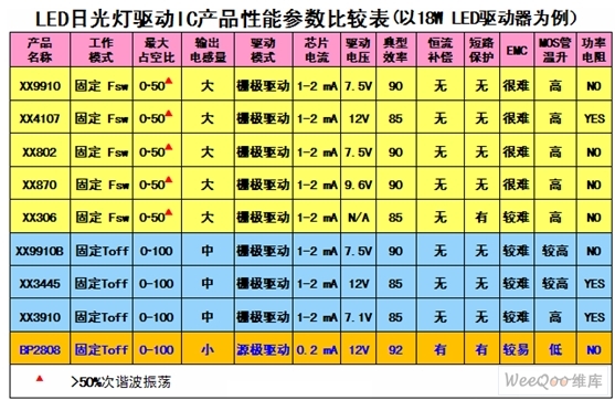 表1LED日光燈驅(qū)動(dòng)IC產(chǎn)品性能參數(shù)比較表