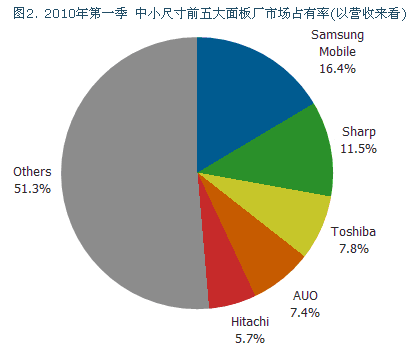Samsung Mobile Displays 不論在出貨量和營收上都維持穩(wěn)定地位,分別在全球市場擁有11.8%和16.84的市場占有率,同時在手機(jī)所需的TFTLCD和AOMLED面板上都有很高的出貨量。Sharp的營收在2010年第二季呈現(xiàn)大幅下滑,這是因為相較于競爭對手而言,市場上對于可攜式游戲機(jī)等裝置的需求下跌所致。 Toshiba的營收沒有像競爭對手下滑這么多,這是因為高分辨率手機(jī)和汽車用顯示器的需求增加所致。