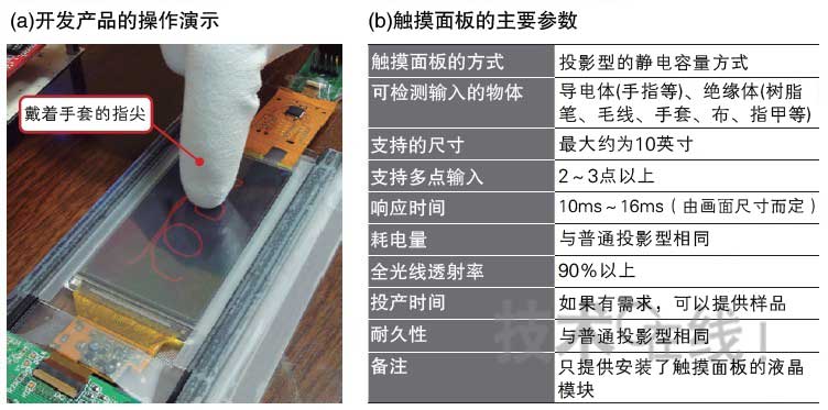 除了可以用絕緣物輸入的特點(diǎn)以外,在具有10ms~16ms的響應(yīng)時(shí)間、90%以上的全光線透射率以及耗電量和耐久性等方面,此次開發(fā)的產(chǎn)品與普通的投影型性能相同。在檢測控制方面,可使用原來用于投影型的控制器IC。