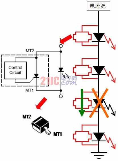 增強LED串可靠性的保護方案如前所述,區(qū)域照明應用中通常會采用多串LED。雖然LED本身的可靠性很高,但如果LED串中的某個LED發(fā)生開路故障,那么整串LED就可能關閉,而街道照明等應用中就要避免這種狀況,從而降低后期維護成本。有鑒于此,安森美半導體推出了NUD4700 LED電流旁路保護器(見圖3)。這器件是一款分流器件,萬一LED串中某個LED開路,則會提供電流旁路,確保在某個LED故障的條件下整串LED不會關閉;而且恰當處理散熱的話,還可支持大于1 A的大電流。