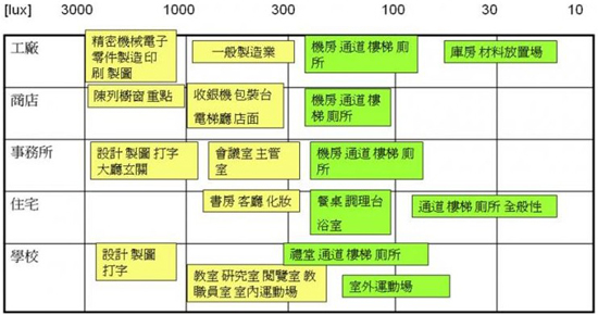 (2)一般照明--辦公室、教室、量販店、一般店面、咖啡店、快餐館、工廠、生產(chǎn)線,則要有300-800Lux。