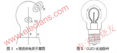 GLED的e旋進(jìn)放電激發(fā)的渾然一體的弧光放電球的外形與傳統(tǒng)的白熾燈泡殼匹配,這是顯而易見的。