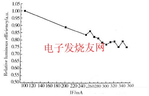 當電流增加時,注入發(fā)光區(qū)的電子發(fā)生非輻射復合的幾率變大,使器件的內(nèi)量子效率降低,同時,由于電流增加導致器件的溫度升高,使熒光粉的量子效率降低并進一步增加了非輻射復合的幾率。在圖5中,由于驅(qū)動電流在正常的工作電流內(nèi),器件的發(fā)光效率雖有一定的降低,但變化的幅度并不大。