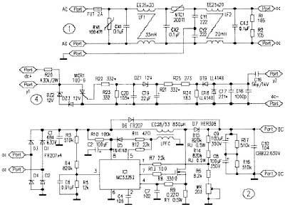 MC33262是一款可靠且成本低廉的功率因數(shù)校正芯片,其應用電路如圖2所示。市電經電源濾波器和整流器得到脈動直流電。電流通過啟動電阻R10向C2充電至10V時,IC1開始工作。整流后的直流脈動電壓在R5的分壓作為取樣信號經IC1的③腳輸入乘法器。