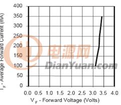 假如用干電池或蓄電池供電,那么因?yàn)長ED伏安特性的非線性,很小的電壓變化就會(huì)引起很大的電流變化,上圖中電源電壓在3.3V時(shí)正向電流為20mA的LED,如果用3節(jié)干電池供電,新的電池電壓超過1.5V,3節(jié)就是4.5V,LED的電流就會(huì)超過100mA,很快就會(huì)燒壞。對(duì)于1W的大功率LED也是如此,圖2是某公司1W的LED伏安特性,而一個(gè)12V蓄電池的電壓,在充滿電到快放完電的電壓可以從14.5V降到10.5V。相差將近20%。從伏安特性上可以看出,電源電壓的10%的變化(3.4V-3.1V),就會(huì)引起正向電流的3.5倍的變化(從350mA變到100mA)。