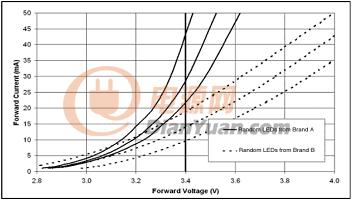 圖5.不同廠家和同一廠家生產(chǎn)的LED伏安特性的離散性
