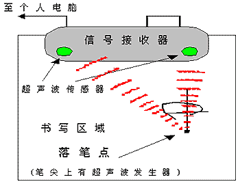 超聲波技術(shù)的原理是:利用超聲波的傳輸速度較慢的特性,根據(jù)超聲波發(fā)射到接收時(shí)間計(jì)算出發(fā)射點(diǎn)到接收點(diǎn)的距離。使用在平面定位上的原理采用的是在屏幕的一邊放置兩個(gè)按固定距離分布的超聲接收裝置,用于定位的筆是一個(gè)超聲波發(fā)射器,當(dāng)筆移動(dòng)在屏幕的表面時(shí),所發(fā)射的超聲波沿屏幕表面被接收器檢測(cè)到,由收到超聲波的時(shí)間可以換算出筆與兩個(gè)接收器的距離。采用三點(diǎn)定位的原理,即根據(jù)三角形已知三個(gè)邊長(zhǎng)可以確定筆所在的頂點(diǎn)原理,計(jì)算出筆所在的位置坐標(biāo)。是一種測(cè)距定位模式。