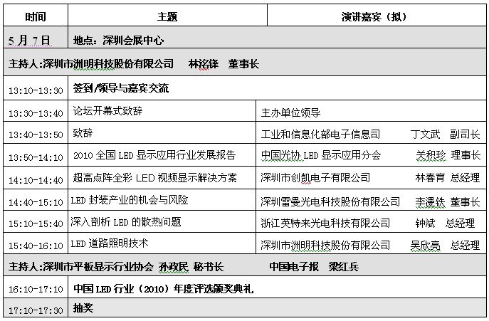 1.講座 主辦方將邀請(qǐng)國(guó)內(nèi)知名LED行業(yè)專(zhuān)家分析2010年中國(guó)LED產(chǎn)業(yè)發(fā)展問(wèn)題、2011年中國(guó)LED企業(yè)的總戰(zhàn)略及調(diào)整方向,預(yù)測(cè)中國(guó)LED市場(chǎng)各領(lǐng)域(原材料、設(shè)備、外延芯片、顯示屏、照明等)的投資情況分析及趨勢(shì)。