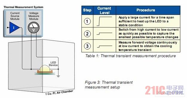 圖3描繪了此類測量裝置的簡圖(不成比例)。測量的第一步是確定前向電壓在一個非常小的電流下的溫度敏感性,這個小電流可以是傳感器或測量電流。之后,LED被施加一個大電流,從而使其變熱。接著停止施加大電流,并且很小的傳感器電流再次出現(xiàn),同時用一個高采樣率完成前向電壓的測量,直至LED結(jié)溫完全趨于穩(wěn)定。由于LED快速的熱響應(yīng),所以測量的硬件設(shè)備必須能夠捕捉LED電流停止施加后幾微秒內(nèi)的溫度(電壓)改變。如圖3所示,被測量的LED處于一個封閉空間內(nèi),這個封閉空間是JEDEC標(biāo)準(zhǔn)的自然對流腔,它提供了一個沒有氣流流通的環(huán)境。T3STer也可以提供類似的裝置。表格1歸納了測試步驟。