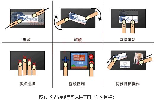 用投射式觸摸屏實現(xiàn)的幾種常見的多點觸摸手勢包括手指的張合、縮放、雙指的滑動和旋轉(zhuǎn)。它們可以快速方便地處理數(shù)據(jù)、內(nèi)容和用戶參數(shù)。便攜游戲和文本/電子郵件應(yīng)用也可以利用多點觸摸技術(shù)。在一個多指觸摸過程中,多觸點APA(全點可尋址)模式可以精確地測定每個手指所按壓的坐標(biāo)位置。