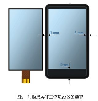 對尺寸小于4英寸(10厘米)的觸摸屏,觸摸屏的邊沿寬度,在觸摸傳感器尾線一側(cè)應(yīng)不窄于10mm,與尾線側(cè)毗鄰的兩側(cè)應(yīng)不窄于3mm。這個邊沿空間用于隱藏把透明的ITO圖案鏈接到控制電路的非透明銀質(zhì)箔線并隱藏控制電路本身。對于使用玻璃基底的觸摸屏,邊沿的寬度或許可以做得更窄,但仍建議使用上述指導(dǎo)原則。圖2 描述了這些指導(dǎo)原則。