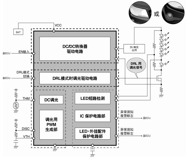最近,汽車用前照燈正在逐漸推進LED化,以高效、長壽這一優(yōu)點為背景,未來有望成為前照燈市場的重心。此外為確保車輛安全、可見度,安裝使用LED前照燈的事例會不斷增加,而未來預計LED前照燈/DRL的搭載也將面向車載用途形成標準規(guī)格系列。目前,LED前照燈只限于高級豪華車等一部分的車型上選用,對汽車制造商、前照燈制造商來說,多采用延用通用的LED驅(qū)動IC,或以分立元器件為主構(gòu)成的形式,如果裝載DRL就需要另外配備與其相配的驅(qū)動電路。羅姆針對未來前照燈的LED化,率先著手開發(fā)了一款專用的IC,并推動獲得前照燈用LED驅(qū)動器所需功能的專用IC的開發(fā)。此次羅姆新開發(fā)的這種前照燈專用LED驅(qū)動IC,特別面向歐美等國先行開始普及的DRL,通過內(nèi)置振蕩器電路實現(xiàn)微處理器控制的PWM調(diào)光。另外,為對應(yīng)要求高可靠性的車載市場需求,在搭載能監(jiān)測LED短路、LED開路等前照燈故障的各種保護功能,與分裝器件構(gòu)成時或與通用的LED驅(qū)動IC組成時的情況相比,通過削減部件數(shù)量從而實現(xiàn)了可靠性的大幅提高。另外,絕對最大電壓設(shè)定為50V,對于鋰離子電池電壓波動也能非常輕松地承受的高耐壓化也得以實現(xiàn)。