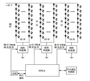 以FPGA作為控制器,根據(jù)上位機(jī)的調(diào)光指令調(diào)整PWM 占空比,從而控制背光亮度;采樣顏色傳感器的數(shù)據(jù),微調(diào)橙燈和藍(lán)燈的PWM 占空比,保證在溫度發(fā)生變化時(shí)色溫不變。