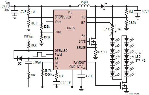 大多數(shù)前燈應(yīng)用需要約 50W LED 電流。凌力爾特公司的 LT3755 設(shè)計成服務(wù)于這種類型的應(yīng)用。它可以將汽車總線電壓(標(biāo)稱值為 12V)提高到 60V,以驅(qū)動多達(dá) 14 個串聯(lián)連接的 1A LED,如圖1所示。