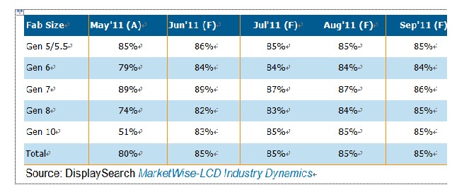 大尺寸TFT LCD面板平均產能利用率在2011年第一季度下降,4月份產能為79%。第二季度市場需求激增,面板商提高產能利用率,6月份將達到85%。面板商原本計劃在第三季度繼續(xù)提高產能,但因為實際市場情況而不得不改變生產策略。