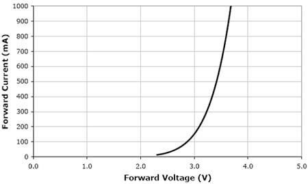 由圖中可知,假如以350mA時的光輸出作為100%,那么200mA時的光輸出就大約是60%,100mA時大約是25%。所以調(diào)電流可以很容易實(shí)現(xiàn)亮度的調(diào)節(jié)。