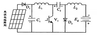 充電控制器作為光伏電池和鉛酸蓄電池的接口電路,一般都希望讓其工作在最大功率點(diǎn),實(shí)現(xiàn)更高的效率,但是在實(shí)現(xiàn)最大功率點(diǎn)跟蹤(MPPT)的同時(shí),還需要考慮進(jìn)行蓄電池充電控制。目前常用的主電路拓?fù)渲饕薪祲盒碗娐罚˙uck)變換器、升壓型電路(Boost)變換器、丘克電路(Cuk)變換器等。一般光伏電池輸出電壓波動(dòng)較大,而Buck變換器或Boost變換器只能進(jìn)行降壓或升壓變換,受此影響,光伏電池不能在大范圍內(nèi)完全工作于最大功率點(diǎn),從而造成系統(tǒng)效率下降。同時(shí),Buck變換器輸入電流紋波較大,如果輸入端不加一個(gè)儲(chǔ)能電容就會(huì)使系統(tǒng)工作在斷續(xù)狀態(tài)下,從而導(dǎo)致光伏電池輸出電流時(shí)斷時(shí)續(xù),不能處于最佳工作狀態(tài);而Boost變換器輸出電流紋波較大,用此電流對(duì)蓄電池進(jìn)行充電,不利于蓄電池的使用壽命;Cuk變換器同時(shí)具有升壓和降壓功能,將Cuk變換器應(yīng)用于光伏系統(tǒng)充電控制器中,可以在較大范圍內(nèi)實(shí)現(xiàn)最大功率點(diǎn)跟蹤,有利于系統(tǒng)效率的提高。因此,常選用Cuk變換器作為充電控制器的主電路,其系統(tǒng)拓?fù)淙鐖D7所示。