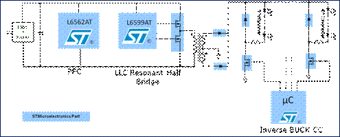 電源電路的最大輸出功率達(dá)到130W (48V,2.7A),該電路由兩級(jí)電路組成:基于L6562AT的前端功率因數(shù)校正器(PFC)和基于L6599AT的LLC諧振轉(zhuǎn)換器。