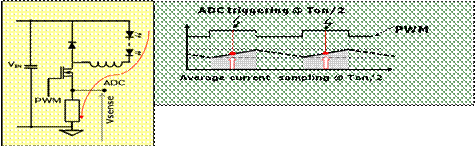 如果能夠保證連續(xù)導(dǎo)通模式運(yùn)行,這個(gè)觸發(fā)操作與隨后的模數(shù)轉(zhuǎn)換過程將會(huì)計(jì)算出均流值,而不是在電流增大期間通過軟件處理過程來估算均流,如圖2b所示。