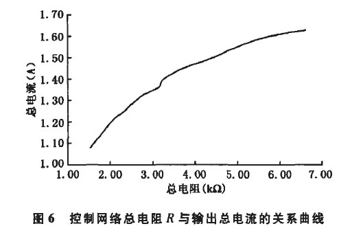 控制電路阻值與輸出總電流的關(guān)系列于表1,其中R為控制電路的等效電阻。經(jīng)過(guò)在恒溫箱中測(cè)試,每2℃記錄1組數(shù)據(jù)得到如圖5所示的NTC熱敏電阻的溫度一阻值曲線。該方案中,驅(qū)動(dòng)電源通過(guò)接收到反饋的溫度信息來(lái)控制輸出電流,根據(jù)圖5中NTC的溫度與阻值的關(guān)系,只要找到輸出電流隨總阻值的變化關(guān)系(如圖6所示),再進(jìn)行適當(dāng)?shù)碾娮杵ヅ洌憧烧业綔囟扰c驅(qū)動(dòng)器輸出電流的關(guān)系。