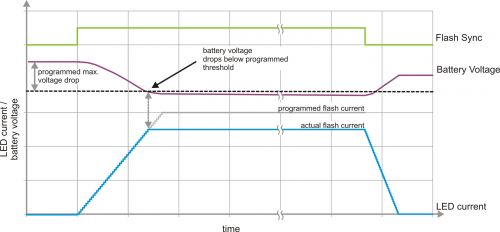 如果閃光燈驅(qū)動器本身能夠防止電池電壓下降過多,那么就可以保持較小的安全界限。通過使用一個受控轉(zhuǎn)換率升高 LED 電流,并在上升期間持續(xù)監(jiān)控電池電壓可以實現(xiàn)這一目標。