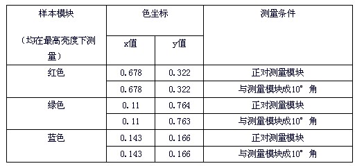 由表1可見,即使人為的偏離基準測量位置達10°角,測得的色坐標數(shù)據(jù)也沒有明顯變化,因此,除去儀器本身固有的精度等原因帶來的測量誤差,由人對儀器進行操作帶來的測量誤差也基本可以忽略。