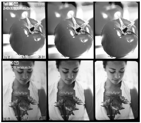 為了能更直觀地比較16bit、18bit 和24bit 的顯示效果差異,特地做了不同位深的手機(jī)顯示效果對(duì)比,從左到右分別為1,600 萬色、26 萬色和65,000色,如圖6 所示:在西紅柿的高光部分1,600 萬色色彩過渡平滑、自然,看不到不均勻的顯示,26 萬色的顯示效果稍遜,而65,000 色能明顯看出不均勻的顯示。