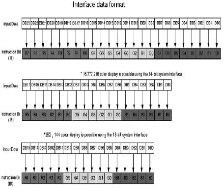 圖4 顯示了圖片的數(shù)據(jù)是怎樣實(shí)現(xiàn)灰階的。第一個(gè)是典型的24bit 顯示接口,數(shù)據(jù)通過GRAM 后轉(zhuǎn)換成8bit Red、8bit Green 和8bit Blue.同理,18bit 的顯示接口將數(shù)據(jù)轉(zhuǎn)換成RGB 666,16bit 的顯示接口將數(shù)據(jù)轉(zhuǎn)換成RGB 565,繼而混色成0到255 灰階的不同色彩。