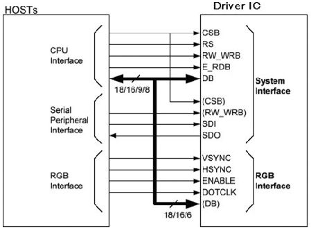 圖2 顯示了一個(gè)典型的主控端的連接方式,CS、RS、WRB、RDB 是控制型號(hào),分別是片選信號(hào)、數(shù)據(jù)或命令、寫/ 讀信號(hào),按照一定的時(shí)序控制,數(shù)據(jù)得以傳輸,畫面才能正常顯示。
