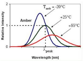 而且當溫度變化時,LED的發(fā)光光譜也會發(fā)生變化。通常溫度增加時光譜的最大值是向波長長的方向漂移。大約是每升高10oC時漂移1nm,升高50度會產生5nm的變化(見圖6)。