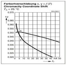 由圖中可以看到,如果正向電流從350mA降低8.75倍到40mA,其相對發(fā)光強度將從100降低到20。降低將近5倍。顯然這是完全不能允許的。所以一定要把電流恒定。