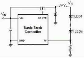 通常儲能電感是和LED串聯(lián),開關導通時,電感儲能;開關斷開時電感通過二極管繼續(xù)有電流流通。由于輸出電壓是輸入電壓減去電感電壓,所以是降壓型。LED中的電流經過檢測電阻測量以后反饋回控制器。來控制PWM的工作比,以實現(xiàn)恒流的控制。