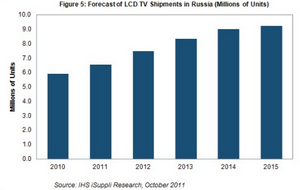 據(jù)IHS iSuppli公司的電視研究報告,隨著青睞先進(jìn)電視技術(shù)的中產(chǎn)階級不斷壯大,今年俄羅斯液晶電視出貨量預(yù)計強(qiáng)勁增長10%。俄羅斯屬于所謂的金磚國家(BRIC),是一個重要市場。