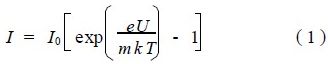 式中m 為復(fù)合因子, I0為反向飽和電流, UT =kT/e 稱為溫度電壓當(dāng)量,在熱力學(xué)溫度T = 300 K時(shí),UT = 26 mV1 在寬禁帶半導(dǎo)體中, 當(dāng)I <0. 1 mA時(shí),通過(guò)結(jié)內(nèi)深能級(jí)進(jìn)行復(fù)合的空間復(fù)合電流起支配作用,這時(shí)m = 2 ;電流增大后擴(kuò)散電流占優(yōu)勢(shì)時(shí)m = 1.U 為外加電壓。