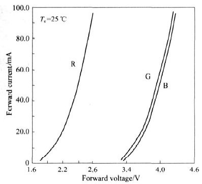 圖1 和圖2 反映了一組R、G、B 3 種LED 的正向電壓VF與正向電流IF 以及IF 與亮度L 間的關系??梢钥闯?超過門限電壓后,隨著VF 的增加, IF 先是緩慢增加而后便急劇增加。