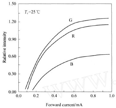 從圖2 的IF 與L 曲線可知, IF 的大小直接影響了L 。當IF 達到一定值以后,L 基本趨于飽和。根據(jù)圖1 和圖2 的VF 、IF 和L 特性,在實際中通常用VF 的方式驅動LED ,用串連電阻值的大小調整LED 的RGB 三基色的IF 使其L 一致。而系統(tǒng)對RGB 三基色的IF 的調整,是以常溫為基本的標準。