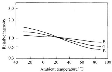 但從LED 的亮度特性圖3 可知,隨著環(huán)境溫度TC 的變化,L ED 的RGB 三基色的顯示亮度偏移狀況各不相同,B 的飄移較小,而R 的飄移較大,當溫度超過80 ℃時,R 相對亮度的變化幾乎是常溫時的2 倍。這種變化完全破壞了常溫時設置的白平衡,使整個顯示屏的色度發(fā)生嚴重漂移,圖像質量變差。RGB 三基色的相對亮度的偏移如圖4 示,可明顯看出,常溫時三基色的亮度狀態(tài)和在85 ℃及- 20 ℃時的相對亮度值,正是L ED 的溫度特性導致冬季和夏季顯示屏的圖像質量變差。