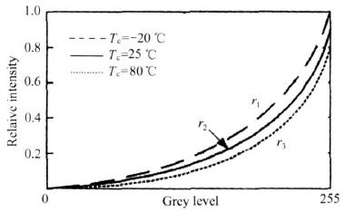 但此方法將損失低灰度級的亮度,降低了圖像的灰度級,即降低了圖像顯示色彩。為了不減少低級灰度且保證對亮度的調整,提出一種針對每個溫度段采用不同的Gamma 參數(shù)來調整相關色彩亮度的技術,以補償環(huán)境溫度對器件的影響。系統(tǒng)針對不同的RGB 的基色設置其獨立的Gamma 反校正參數(shù)。