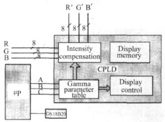 為了補償LED 因溫度引起的亮度變化,LED 顯示系統(tǒng)增加了亮度檢測電路。實驗發(fā)現(xiàn),以20 ℃溫度間隔對色彩進行溫度補償時,能基本上滿足圖像的觀看質量。為此,系統(tǒng)以常溫為基礎,每隔20 ℃給出相應基色的Gamma 校正參數(shù)。對于- 20 ℃~ + 80 ℃范圍,每個基色給出供5 種不同的Gamma 參數(shù)以補償亮度的變化。圖6 給出系統(tǒng)的溫度檢測電路和相應的控制Gamma 參數(shù)的電路框圖。利用溫度傳感器DS18B20檢測環(huán)境溫度的變化,當環(huán)境溫度到達設定溫度值時,通過微處理器的ARC 3 個I/ O 線輸出5 個溫度狀態(tài)中的某一狀態(tài)值給CPLD。在CPLD 內部設有RGB 三基色(3 ×4 + 1 = 13)13 個(常溫時采用一個標準的Gamma 參數(shù)校正,在其他溫度下,每個基色一個校正參數(shù)) Gamma 值的參數(shù)表,從表查出分別對應RGB 的3 個Gamma 值提供給亮度控制電路和顯示控制電路。