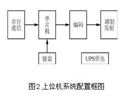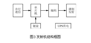 發(fā)射機(jī)由單片機(jī)、鍵盤(pán)、編碼器、發(fā)射器、串行通信接口和UPS供電系統(tǒng)組成,其結(jié)構(gòu)框圖如圖3所示。