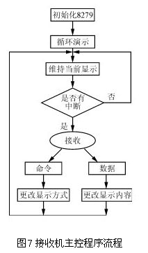 該部分軟件的功能是完成對(duì)接收數(shù)據(jù)的識(shí)別、存儲(chǔ)、變換和顯示驅(qū)動(dòng),并可實(shí)現(xiàn)本地本機(jī)的自檢,顯示固化圖像。當(dāng)接收裝置的譯碼芯片有輸出時(shí),單片機(jī)就中斷當(dāng)前的顯示,接收標(biāo)志字,然后判斷此標(biāo)志字的內(nèi)容,確定將接收的是圖像點(diǎn)陣,還是操作控制命令。若是點(diǎn)陣數(shù)據(jù),就將其連續(xù)接收存放到一個(gè)顯示緩沖數(shù)據(jù)庫(kù)中,按當(dāng)前的方式顯示。若是命令,則立刻改變顯示方式。