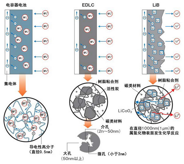 LIB的電子隨著正極中鋰金屬氧化物的化學(xué)反應(yīng)而移動,因此充放電需要一定時間。而電容器電池或LIC是隨著離子的移動來交換電子的,因此反應(yīng)很快。因而可實現(xiàn)幾分鐘~10分鐘左右的高速充放電。