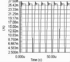 要保證PWM 周期小于電感的τ 時間, 因?yàn)槿鬚WM 的周期大于τ, 則極有可能出現(xiàn)在PWM 的占空比變化的情況下, 電路中電流都能達(dá)到電感的飽和直流電流, 影響了對LED 電流調(diào)節(jié)。當(dāng)C8051330 的時鐘頻率是25 MHz ,PWM 的周期的選擇對電流改變檔位的影響很大。若周期越大, 則PWM 占空比的檔位越多, 反之越少。擬用256 個檔位的占空比, 因此PWM 波的頻率應(yīng)選擇在100kHz 以下,即周期在10 μs 以上,直流電感為10Ω, 此時電感值應(yīng)選擇大于0.1 mH.圖2 分別是PWM 頻率為100kHz , 占空比為90%, 電感為0.1 mH、1 mH 和40 mH 時電路電流值的模擬結(jié)果。