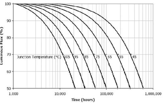 圖1. Cree公司LED的結溫和光衰壽命試驗結果
