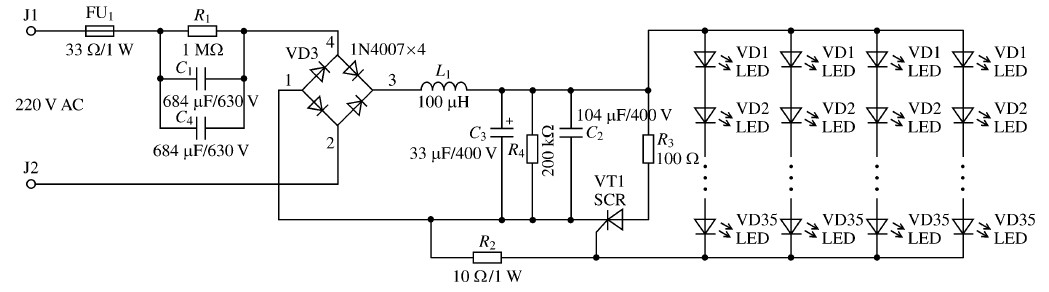 該電路共驅(qū)動140只白光LED (小功率) ,采用35串4并的模式,采用電容降壓式驅(qū)動方式。其中, C1、C4 為并聯(lián)的兩個相同的電容,起降壓及限流作用; 4個1N4007組成的整流橋?qū)斎虢涣麟妷哼M(jìn)行整流;濾波電容C3 用于濾除整流輸出電壓中的交流成分,使電壓更為平滑; L1、C2 用于濾除輸出電壓中的高頻成分;電阻R4 為C3 提供放電回路;采用單向晶閘管SCR729210對電路進(jìn)行保護(hù), R3 為限流電阻。
